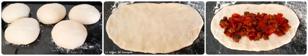 Passado o tempo, abra cada bolinha em uma forma oval, recheie com o recheio de berinjela, deixando uma borda de cerca de 2 dedos em toda a circunferência….