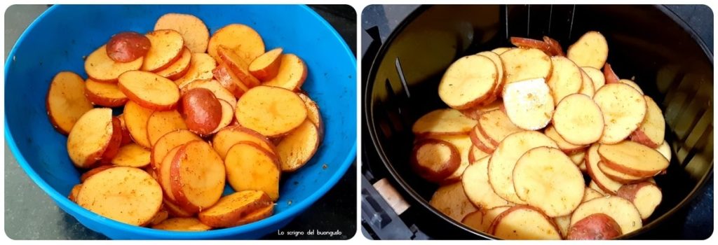 Neste ponto, pegue o cesto da fritadeira a ar e sem usar papel ou cestos para esta fritadeira, despeje as batatas temperadas e deixe cozinhar a 200°C por cerca de 40 minutos.