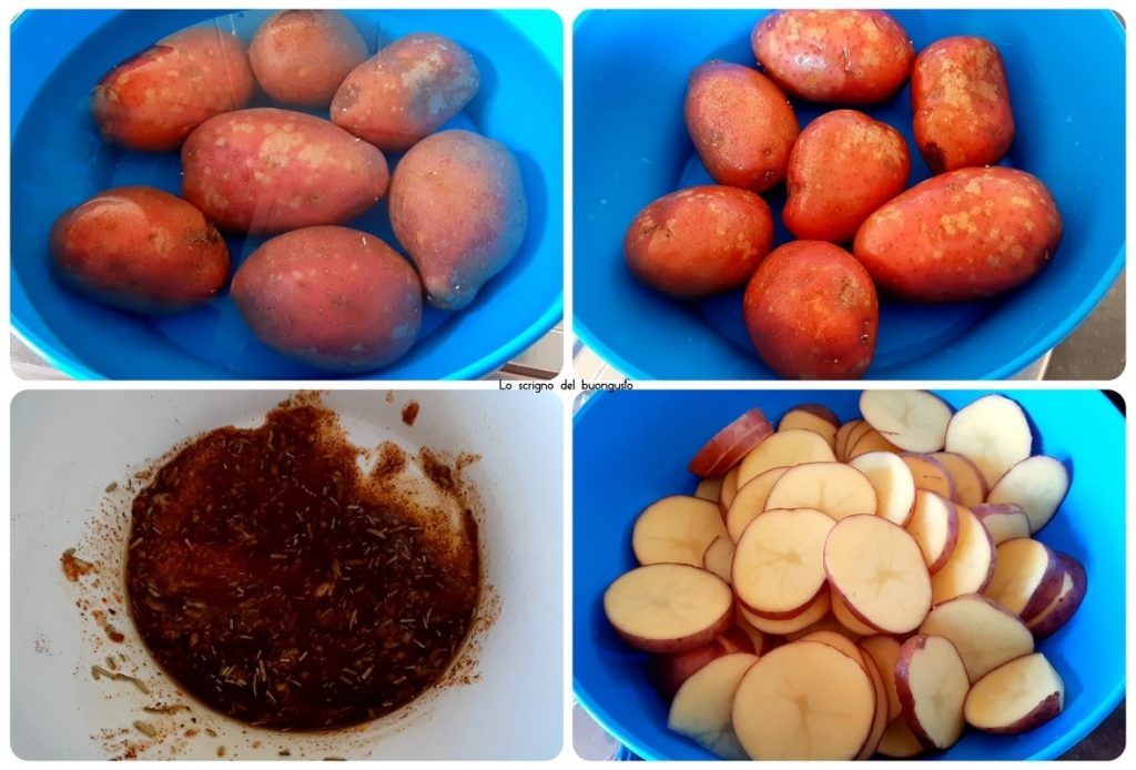 Lave bem as batatas sem remover a casca, depois escorra bem e seque-as, cortando em fatias grossas de cerca de 2 milímetros (ou espessura a gosto).
