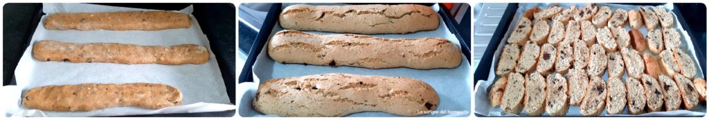 Depois do tempo, transfira cada rolinho para uma tábua para cortar nossos biscoitos (com uma faca serrilhada), corte biscoitos com uma espessura de cerca de um dedo, coloque-os novamente na assadeira com o lado cortado em contato com a base da assadeira, reasse por 10-12 minutos.