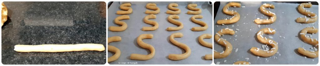 Após o descanso da massa na geladeira, pegue a massa, faça cordões com cerca de 15 centímetros de comprimento, coloque-os em uma assadeira forrada com papel manteiga e dê a forma de um ‘S’.