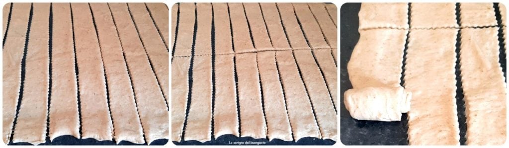 • Corte todas as tiras largas cerca de 4 cm e, uma vez cortadas todas, corte no meio no sentido horizontal para obter 20 meias tiras.