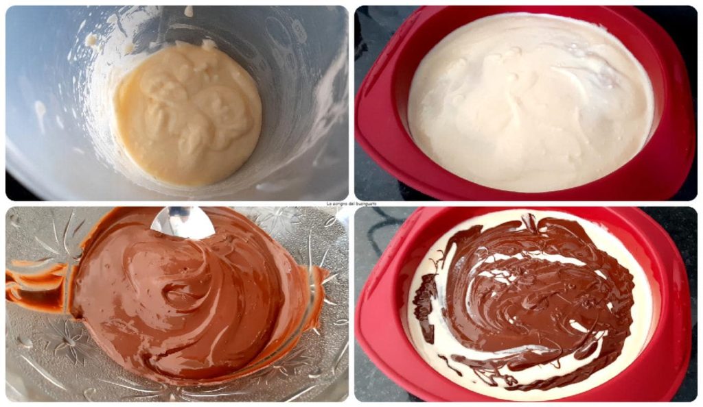 Neste ponto, pegue uma forma de 22-24 cm de diâmetro, unte e enfarinhe, ou use uma forma de silicone como eu fiz, despeje metade da mistura e leve ao forno pré-aquecido a 180 °C por 15 minutos.