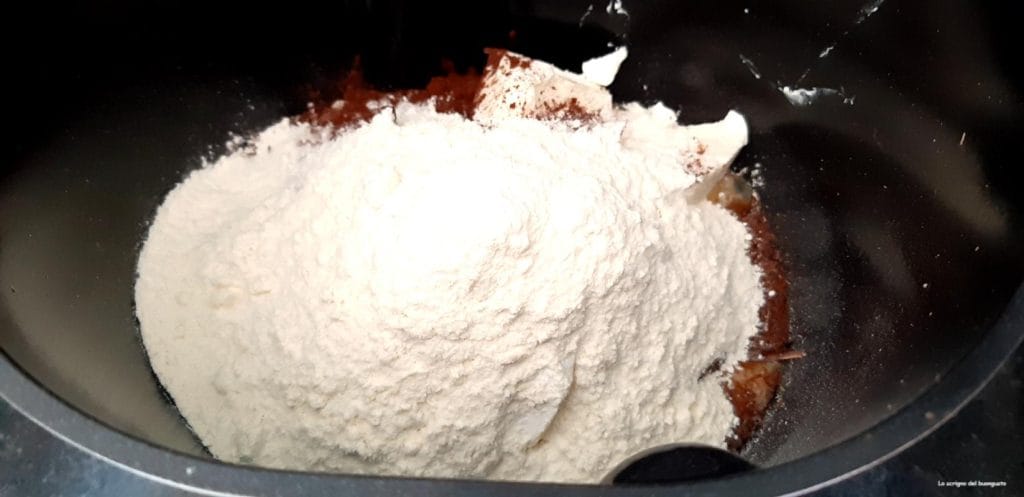 No cesto da máquina de pão, coloque os ovos, a manteiga, o leite, o açúcar, o chocolate amargo cortado, a farinha, o cacau e, por último, o fermento para bolos.