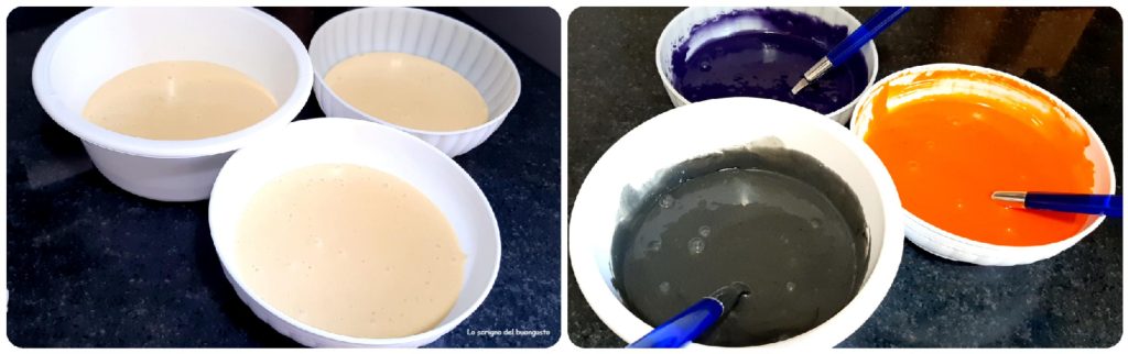 Neste ponto, divida a mistura obtida em três tigelas diferentes, em cada tigela coloque um corante diferente: em uma o preto, em outra o roxo e na última o laranja.