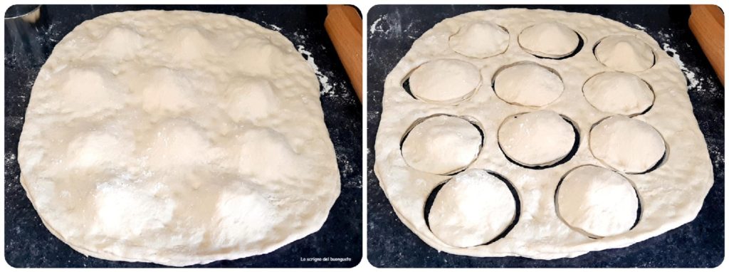 Coloque por cima a segunda camada, pressione com as mãos para criar círculos e, em seguida, com um cortador de 8 cm recorte as bombas.