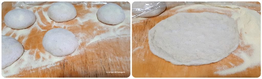 Após a fermentação, despeje a massa fermentada sobre uma superfície de trabalho levemente enfarinhada, faça bolinhas enfarinhando-as com a semolina, deixe-as repousar por meia hora antes de trabalhá-las.