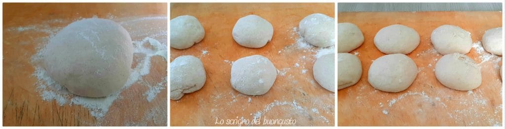 Após a levedura, colocamos a massa em uma bancada enfarinhada, amassamos até formar uma bola novamente e a dividimos em 11 pedaços formando 11 bolinhas, posicionando-as bem espaçadas na bancada e deixamos crescer cobertas por pelo menos 30 minutos.