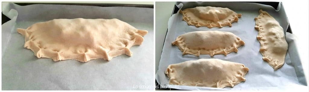 Selamos bem as bordas e os colocamos espaçados em uma assadeira forrada com papel manteiga e deixamos descansar por cerca de 30 minutos.