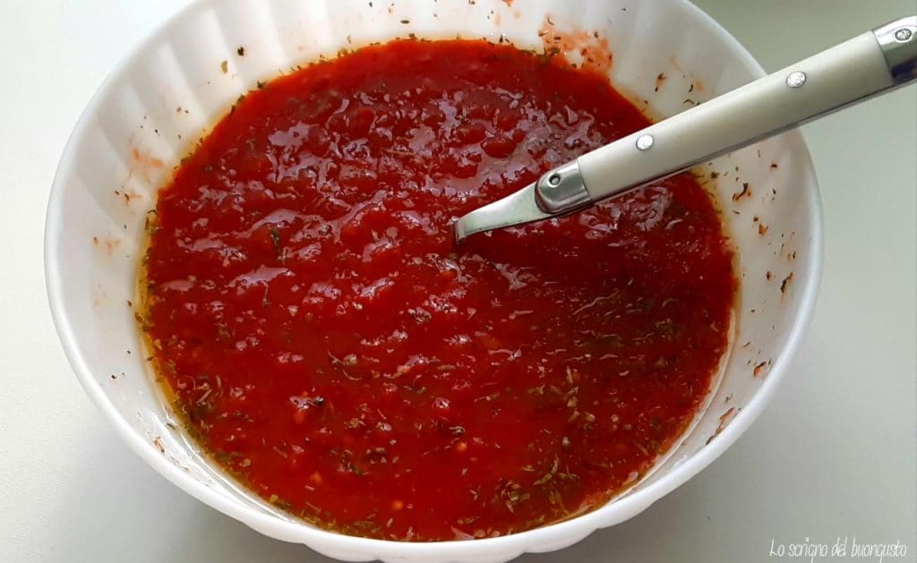 Enquanto isso, preparamos o molho de tomate, colocando o tomate em uma tigela e temperando com óleo, sal e orégano, misture bem e reserve.