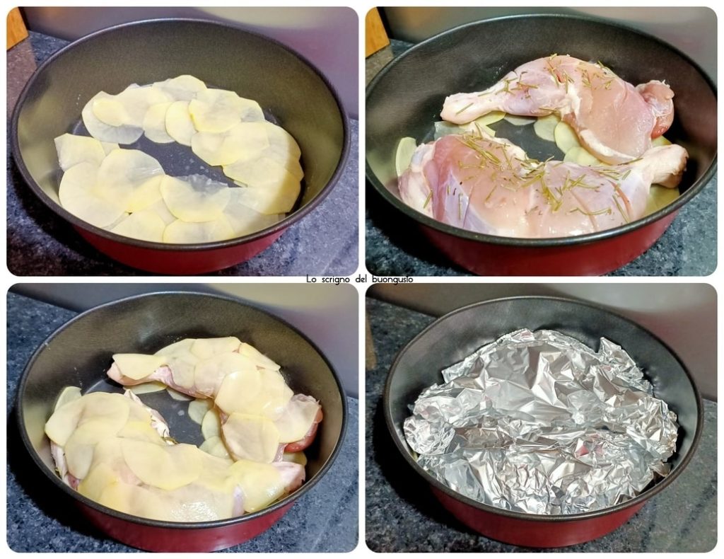 Em uma assadeira, coloque um fio de azeite, faça uma base com as fatias de batata previamente cortadas, coloque o frango e depois cubra a superfície da carne com as outras fatias de batata.