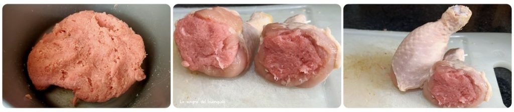 Recheie cada coxa de frango com a carne moída e ajuste bem a coxa para que acomode a carne.