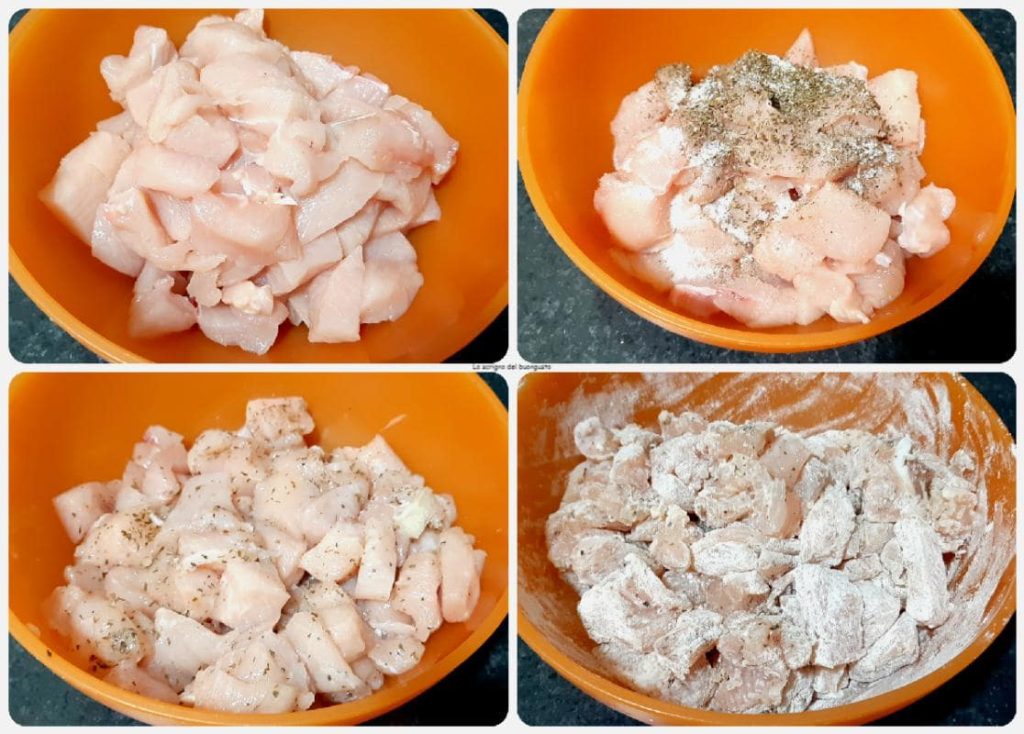 Primeiro, corte o peito de frango ou as coxas (sem osso) em cubinhos, transfira-os para uma tigela, esprema um limão sobre a carne e misture bem, coloque na geladeira até a hora de cozinhar.