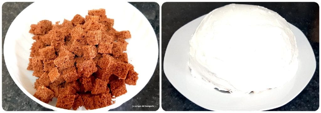 Uma vez que a cúpula esteja fria, retire-a da geladeira, vire o conteúdo em um prato de servir, remova o filme plástico, cubra toda a parte externa da cúpula com o creme de leite e, em seguida, cubra completamente com os cubinhos de pão de ló preparados anteriormente.