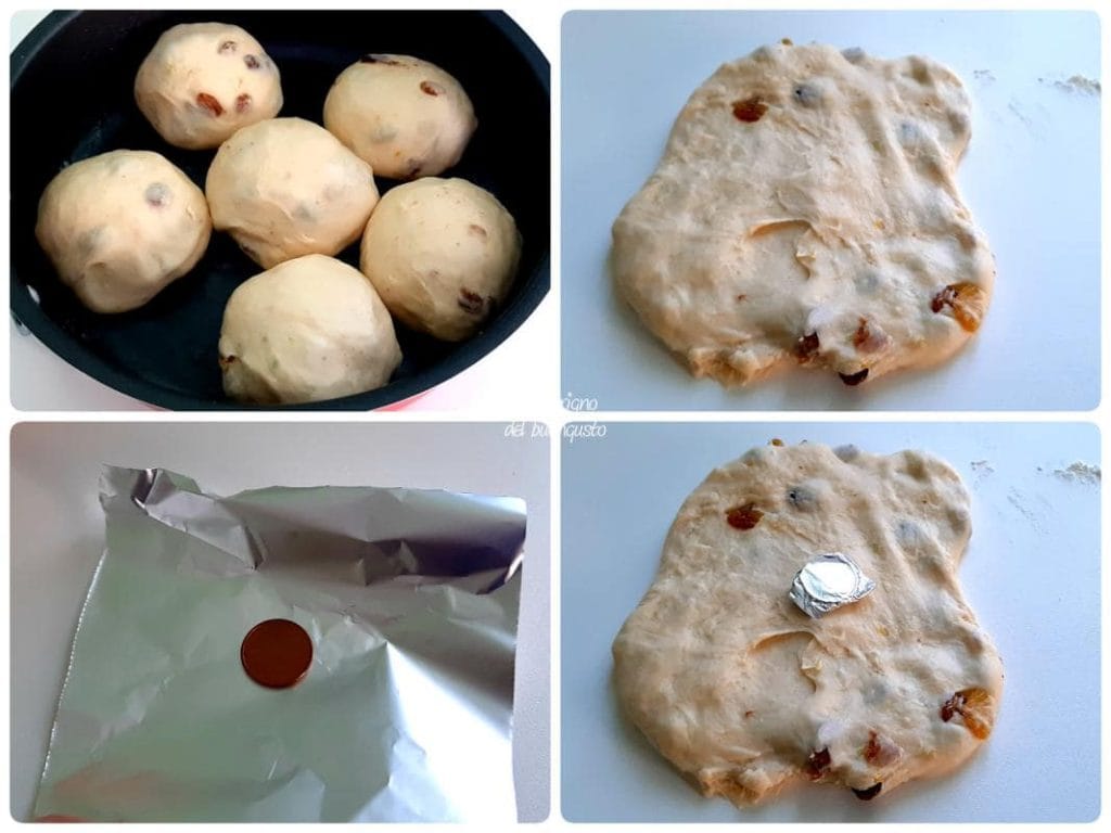 Divida a massa em 8 ou 10 bolinhas, eu fiz 8, das quais 7 com cerca de 215 g e com a massa restante a bolinha central que deve ser ligeiramente maior, em uma das bolinhas estendemos a massa, colocamos a moeda ou outro objeto envolto no papel alumínio, enrolamos a massa e criamos novamente a bolinha.