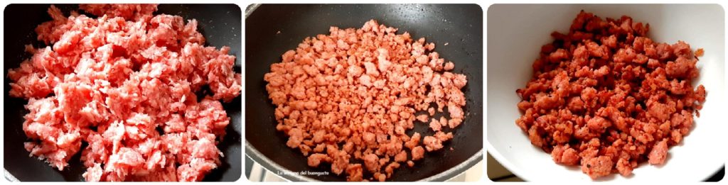 • Começamos pegando a massa de linguiça, desintegrando-a em uma frigideira antiaderente e começamos a cozinhá-la tentando separá-la bem enquanto cozinha.