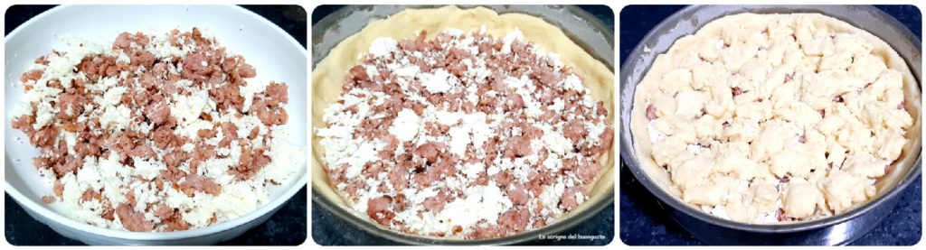 • Junte a muçarela desintegrando-a na massa de linguiça reservada, misture bem e despeje sobre a base da torta.