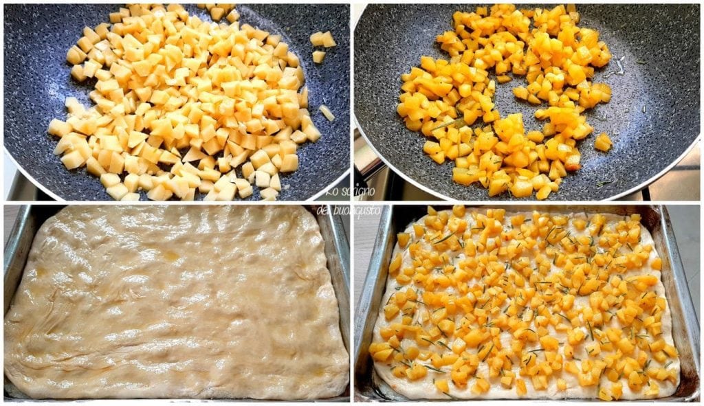 Obviamente, em vez de cozinhar as batatas em uma panela e depois colocá-las na focaccia, você também pode cortar as batatas bem finas e colocá-las cruas na pizza e temperá-las, mas pessoalmente, mesmo que leve mais tempo, a versão que proponho é muito melhor.