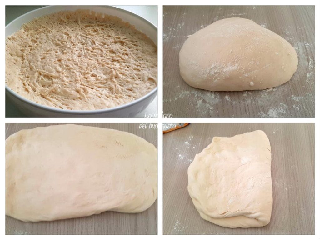 Após a fermentação da massa para a focaccia, pegue-a e despeje-a na superfície de trabalho enfarinhada, trabalhe-a por apenas um minuto recriando uma bola, achate e crie um retângulo, dobre ao meio
