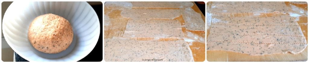 Uma vez feita a massa, transfira-a para uma superfície de trabalho e, com a máquina de macarrão, trabalhe até obter folhas, como fazemos para o macarrão ao ovo.