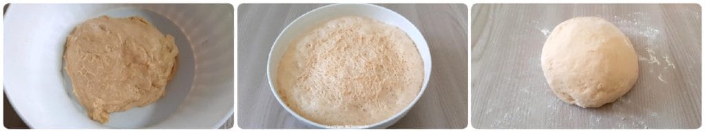 Uma vez que a massa tenha levedado, transferir para uma superfície levemente enfarinhada e formar uma bola