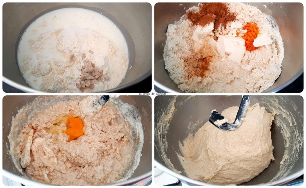 Em seguida, adicione a casca e o suco de laranja, noz-moscada, canela, gengibre, sal, manteiga e misture novamente até ficar homogêneo.