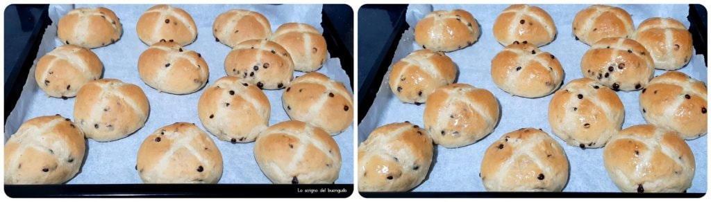 Quando os hot cross buns estiverem assados, pincele-os imediatamente com a calda obtida.