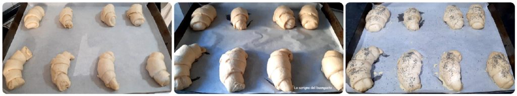Deixe fermentar novamente por cerca de 1 hora e meia, depois pincele com a mistura de gema e leite e polvilhe a superfície dos pãezinhos com sementes de papoula ou gergelim.