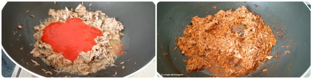 Pegue uma frigideira antiaderente e refogue os dentes de alho amassados com o azeite, depois junte o atum escorrido e desfiado, ajuste o sal e a pimenta e deixe tomar gosto por alguns minutos.