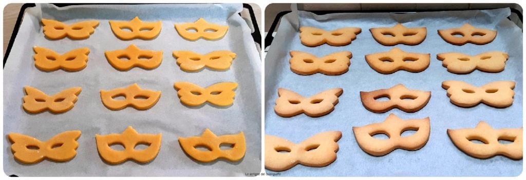 • Prepare uma assadeira forrada com papel manteiga, coloque as máscaras cortadas e leve ao forno pré-aquecido a 180°C por 10-15 minutos, verificando o cozimento.