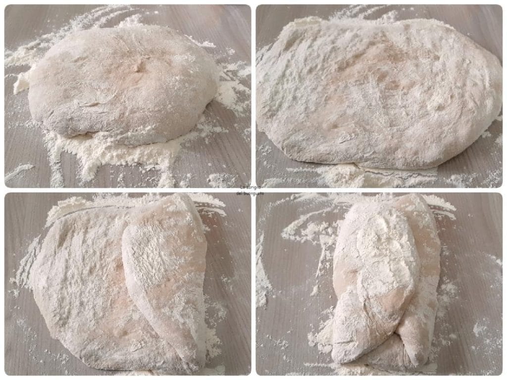 Após a fermentação, transfira a massa para uma superfície bem enfarinhada, crie uma bola ainda macia, faça dobras polvilhando farinha conforme necessário, fazendo pelo menos 3 rodadas de dobras.