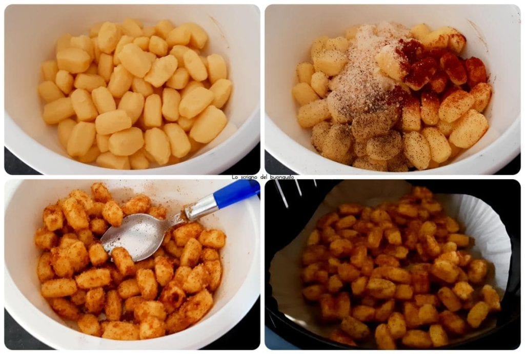 A escolha de cozinhá-los na fritadeira sem óleo ao invés de fritar de maneira clássica se deve principalmente ao fato de que o tempero permanece grudado nos nhoques e eles não ficam encharcados de óleo.