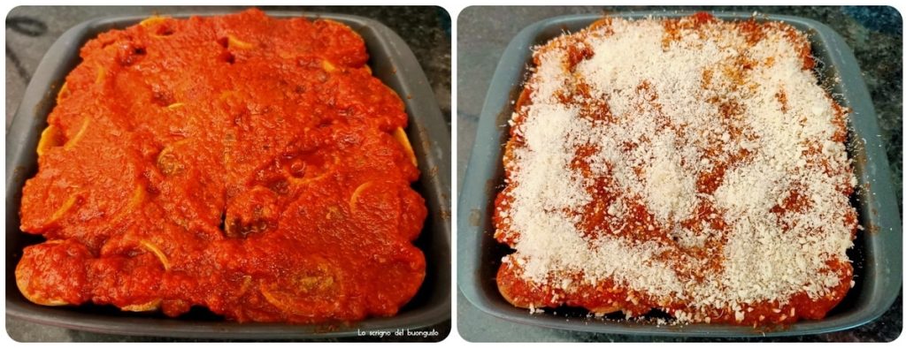 • Quando a assadeira estiver completa, coloque o molho na superfície e cubra com uma pitada de parmesão reggiano.