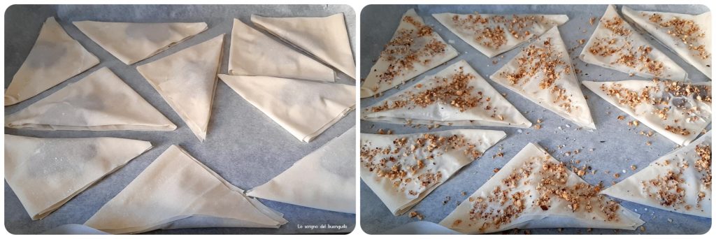 Pegue a massa filo, abra-a bem e estenda de modo que obtenha dois retângulos de duas camadas (não faça apenas uma camada porque são muito finas), corte tiras retangulares e na base coloque uma colher de chá cheia de Nutella que fecharemos em triângulo duas vezes.