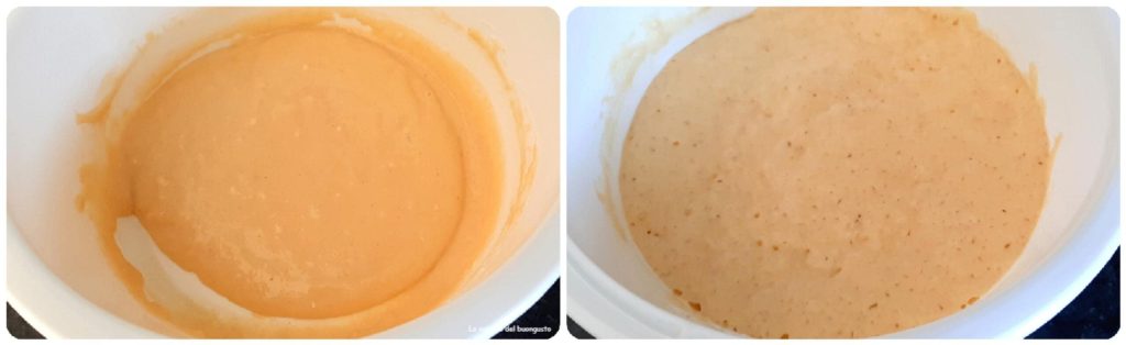 Adicione a baunilha, o rum, o açúcar, a casca de limão ralada, uma pitada de sal e misture bem para obter a segunda massa… resultará macia e um pouco pegajosa, mas isso também depende da farinha que você for usar, de qualquer forma está certo assim.