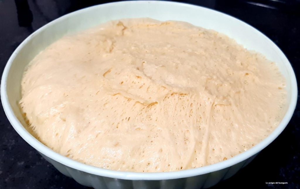 Para a primeira massa, dissolva os 5 gr de fermento em uma colher de sopa de água morna e depois adicione ao pré-fermento que terá crescido, comece a amassar colocando um pouco de farinha, depois adicione um ovo, a manteiga amolecida, o leite e termine de amassar com a farinha prevista sempre para a primeira massa.