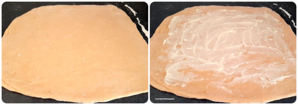 Repita a operação 2-3 vezes até utilizar toda a manteiga e a cada final de dobras estenda a massa para obter um retângulo, começando de novo.