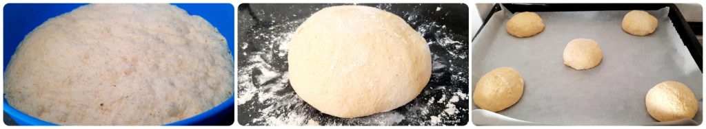 • Quando a fermentação estiver atingida, transfira a massa para uma superfície de trabalho enfarinhada, forme uma bola, divida em 5 partes iguais, forme bolinhas e coloque-as em uma assadeira forrada com papel manteiga ou assadeira antiaderente.