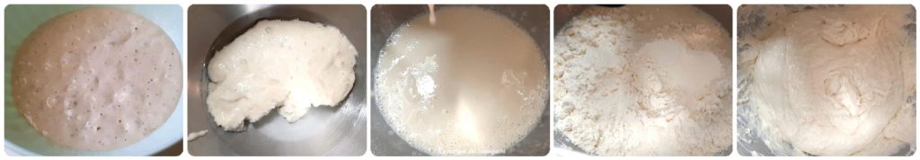 Em uma tigela colocar 100 gr de água e dissolver o fermento, depois misturar e adicionar a farinha, misturando bem para obter uma massa densa.