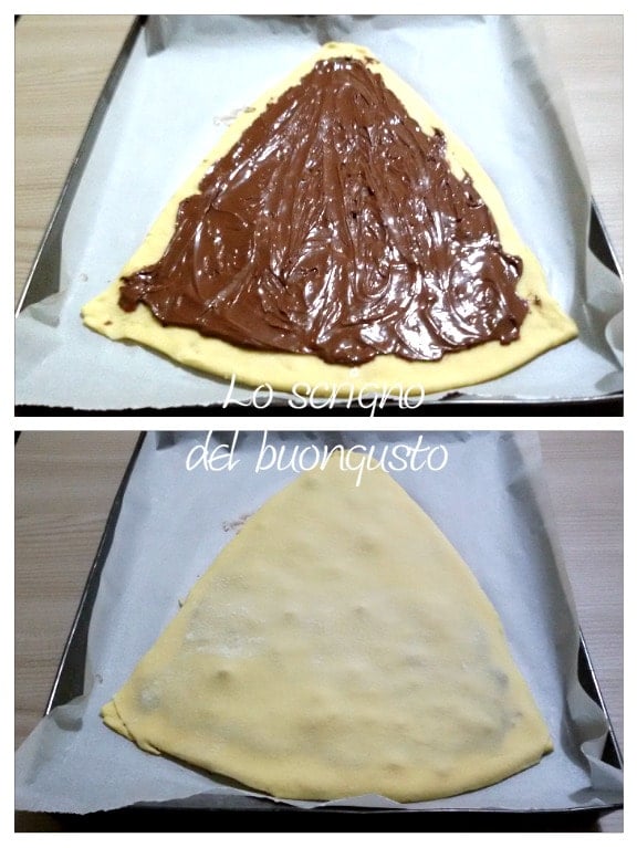 Após a fermentação, retomar a massa e sobre uma superfície de trabalho, dividi-la em três partes, sendo que a terceira parte é menor que as outras, trabalhar uma das duas partes maiores obtendo um triângulo com uma base e uma ponta arredondadas e da ponta à base medirá cerca de 35-36 cm e a base será de cerca de 24 cm.