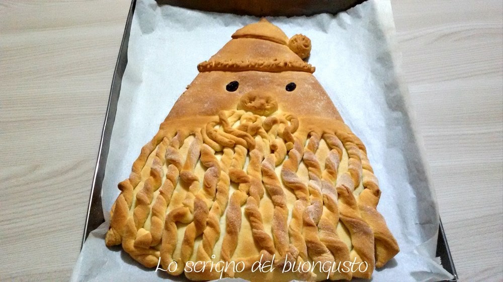 • Agora, com a parte menor da massa, podemos obter um retângulo com a base arredondada que servirá para decorar, cortando todas as tirinhas largas de um dedo e torcidas em espiral para criar a barba do Papai Noel (ver foto).