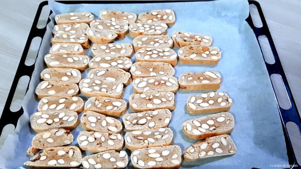 • Corte em fatias com cerca de um dedo de espessura, mas também menos, e coloque novamente na assadeira, leve ao forno por mais 5-10 minutos, verificando o cozimento.
