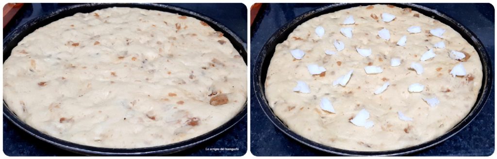 Deixe descansar por cerca de 30-45 minutos, depois cubra a superfície da pizza com todos os pedaços de banha e coloque no forno pré-aquecido a 220°C por cerca de 20 minutos, verificando o cozimento.