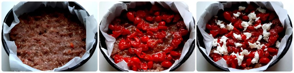 Pegue uma forma grande de cerca de 32 cm de diâmetro, ou você pode fazer duas, forre com papel manteiga, coloque a mistura e nivele a carne até as bordas da forma.