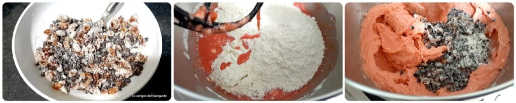 Pegue as gotas de chocolate extra amargo e a uva passa e passe em um pouco de farinha.