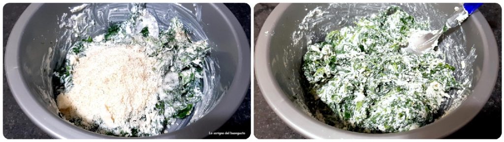 Deixe descongelar o espinafre, depois esprema bem e adicione a ricota, misture bem, depois adicione sal e pimenta a gosto…