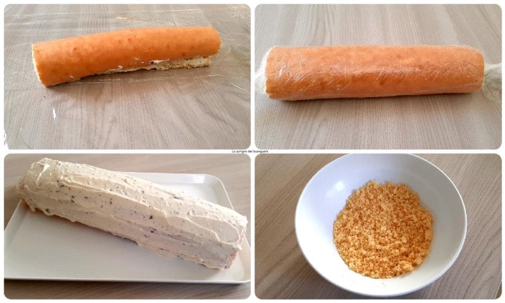 Passado o tempo, retome o rocambole, espalhe o creme restante cobrindo bem, em seguida, triture os pedaços da base do rocambole reservados, aqui eu esqueci de adicionar uma pitada de corante às migalhas obtidas para a finalização do rocambole, teria gostado que ficasse um pouco mais colorido.