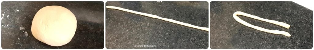 Depois de crescida, divida a massa em 15 pedaços iguais, forme um cordão fino de aproximadamente 30 cm para cada pedaço, depois dobre ao meio e enrole sobre si mesmo unindo as extremidades para formar a rosquinha.