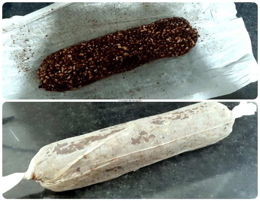 Uma vez criada a mistura, despeje-a em um folha de papel manteiga, dê a forma de um salame, embrulhe bem com o papel e coloque na geladeira por meia hora antes de consumi-lo.