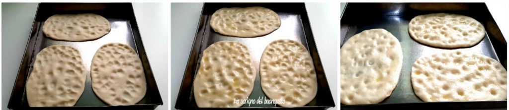• Passado o tempo, forme as schiacciatine com a ajuda de um rolo, unte as assadeiras para as schiacciatine, coloque-as e pincele com azeite, faça pequenas cavidades com os dedos ou fure com um garfo e deixe crescer novamente por 15-20 minutos